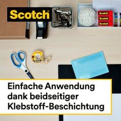 Scotch® Doppelseitiges Klebeband ist auf beiden Seiten mit permanentem Klebstoff beschichtet, der Dinge zusammenhält, ohne dass man es sieht. Das doppelseitige Klebeband ist eine schmutzfreie Alternative für leichte Befestigungen, Schnellreparaturen oder Ergänzungen Ihrer Projekte. Das starke, langlebige und fotoverträgliche doppelseitige Klebeband von Scotch® trocknet weder aus noch vergilbt es mit der Zeit.