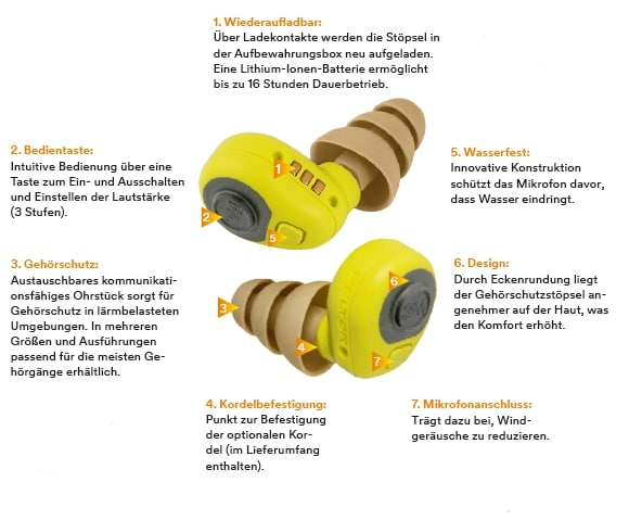 Ob Impuls- oder Dauerlärm – mit einem Paar PELTOR Gehörschutzstöpsel LEP-100 ist das Gehör adäquat geschützt. Das Produkt eignet sich besonders für den Jagd- und Schiesssport, aber auch für die Anwendung im Bereich Bau, Produktion und Instandhaltung. Lautstärke sowie Empfindlichkeit der Geräte lassen sich der jeweiligen Lärmsituation ideal anpassen – die Bedienung ist intuitiv und erfolgt über eine einzige Taste.
